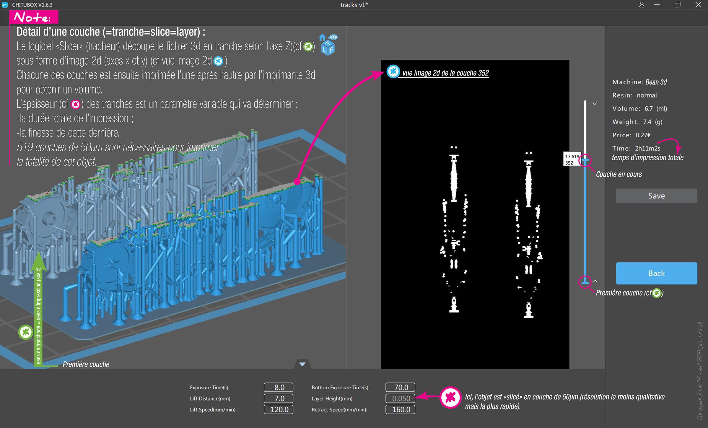 La led UV, au travers d’un écran lcd, projette une image (couche - slice) dans un bain de résine.