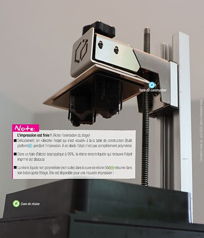 Détachée de la table de construction, la pièce 3d imprimée est plongée dans un bain d’alcool Isopropylique à 99% pour dissoudre la résine liquide qui la recouvre.