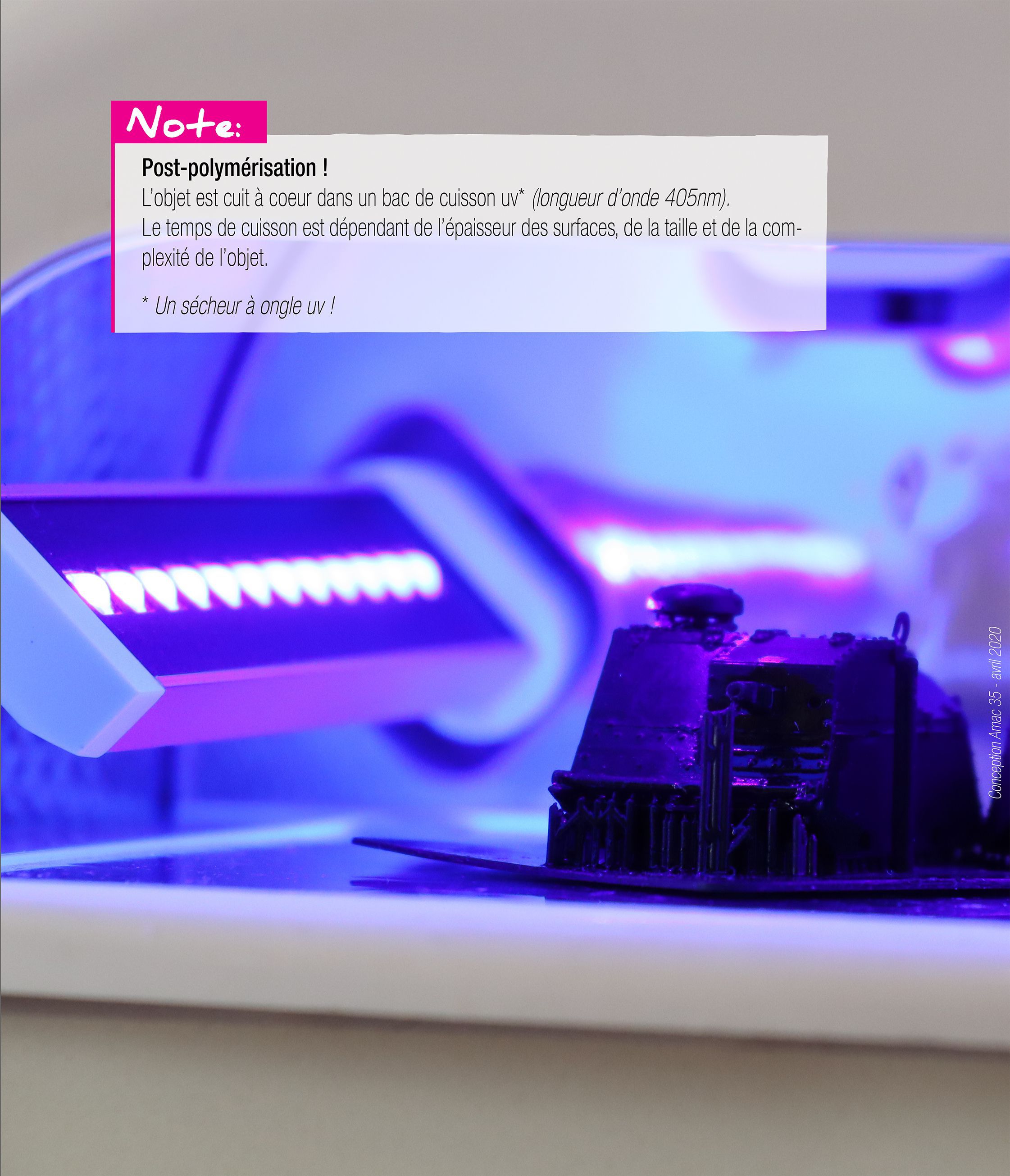Rincée à l’eau claire, puis séchée au sèche-cheveux, la pièce est passée dans un bac UV pour parfaire la polymérisation de la résine.