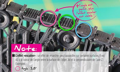 La particularité des tirages 3D est également de présenter une crénulation de surface (petites marches d’escalier). Aujourd’hui toutefois, les imprimantes 3D permettant d’avoir une crénulation discrète sont devenus abordables.
