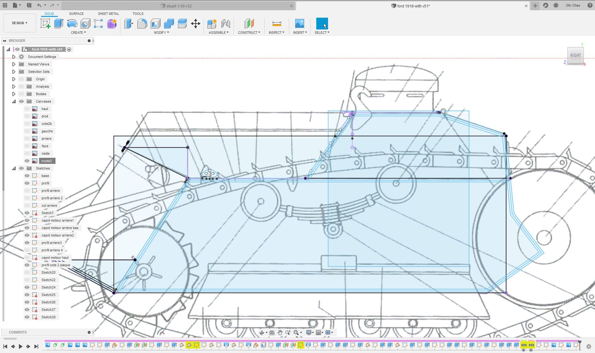 (ci-dessous, le tout début de la modélisation de la caisse du Ford 3 ton M 1918, vue de côté)